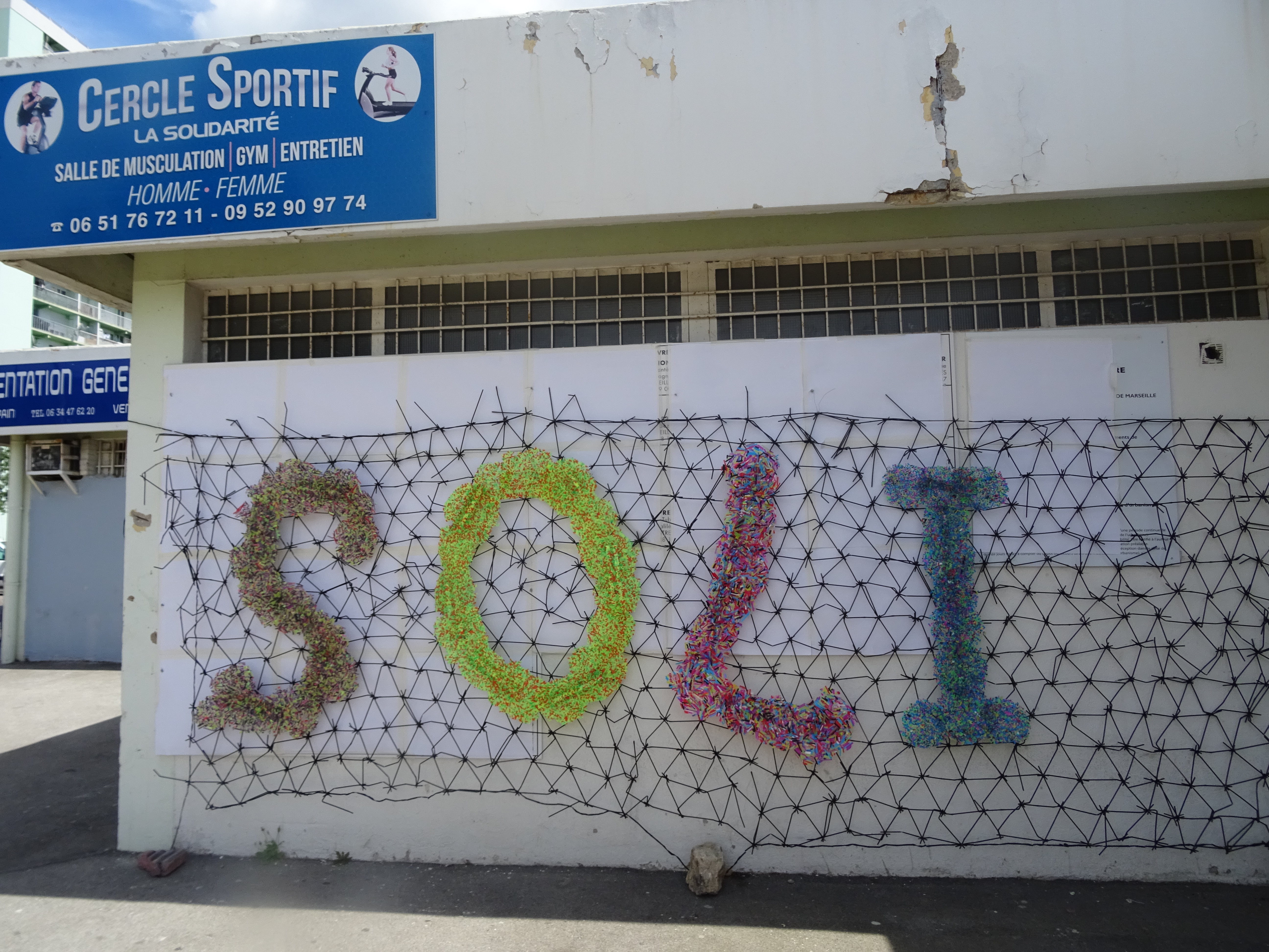 L’artiste de l’atelier, Matthieu Herreman, a accompagné ce jour-là la conception d’une œuvre collective en pailles à boire, son médium de prédilection, dont l’installation à l’entrée de la Salle Polyvalente a attiré de nombreux habitants curieux. Une œuvre collective géante portant le nom du quartier « SOLI » a ainsi vu le jour, et été installée in situ pour l’exposition.