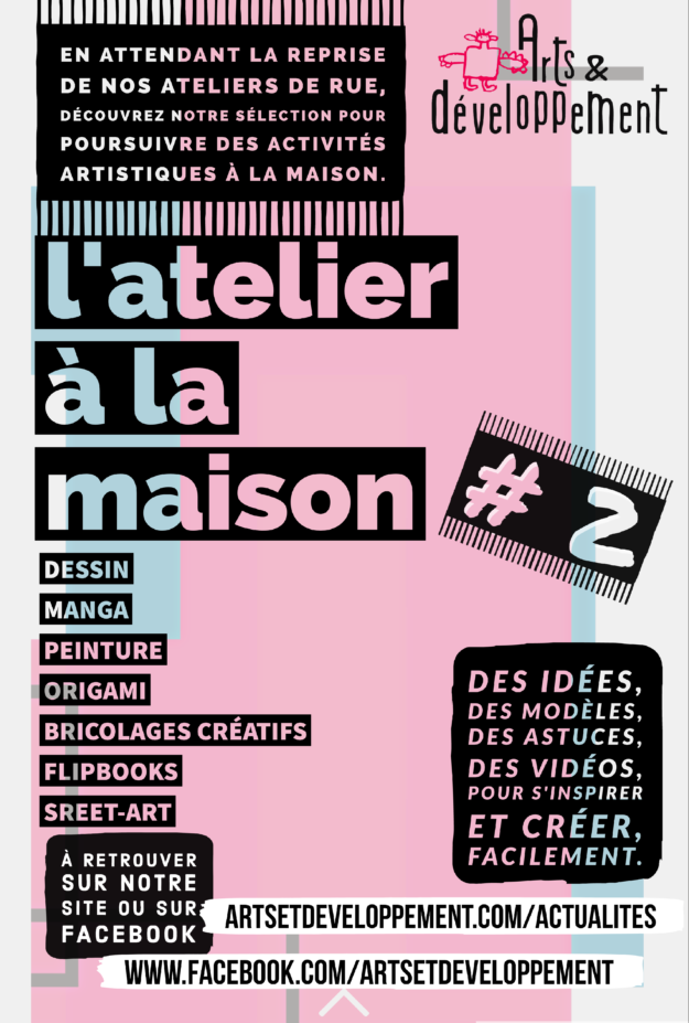 Bonjour à tous,en attendant le retour de nos ateliers de rue dans votre quartier, voici notre nouvelle sélection d’activités artistiques et culturelles : « L’atelier à la maison # 2 ». Des idées, des modèles, des astuces, des artistes, pour s’inspirer et créer, facilement, chez soi. Transmettez-nous vos réalisations par mail à : artsetdeveloppement@gmail.com, nous les présenterons lors de…